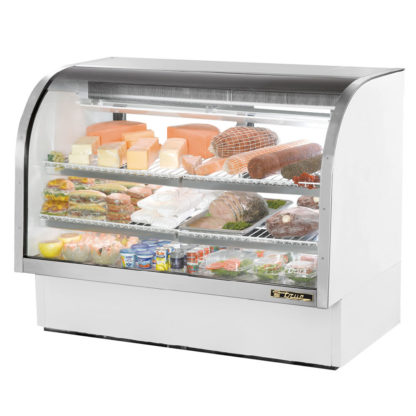 Curved Glass Deli Case, 60-1/4″W, service type, self-contained refrigeration, gravity coil 55% RH, envir. 75°F, (2) sliding Low-E thermal glass rear doors, (4) adjustable white wire shelves, LED interior lights, white aluminum sides & top interior, white exterior, stainless steel floor with coved corners, 1/2 HP, 115v/60/1-ph, 12.7 amps, NEMA 5-20P, cULus, UL EPH Classified, Made in USA