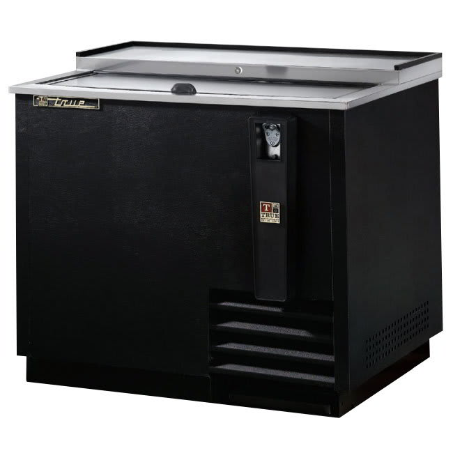 The exterior’s front, sides, and back are made of black powder-coated, cold-rolled steel with a stainless steel countertop and lids, and the interior is made of heavy-duty galvanized steel. The entire cabinet structure is constructed with foamed-in-place, high-density polyurethane insulation, which—along with a black powder-coated steel frame rail—provides stability to the cabinet. The True TD-36-12-HC bottle cooler can accommodate 11 cases of 12-ounce bottles or 14.5 cases of 12-ounce cans. Inside the cabinet, two PVC-coated dividers separate drinks to maximize storage.