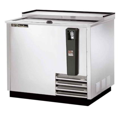 The True TD-36-12-S-HC forced-air bottle cooler can hold 11 cases of 12-ounce bottles or 14.5 cases of 12-ounce cans. Constructed of stainless steel, the countertop and sliding lid are equipped with barrel locks for protection against theft. The exterior front, sides, and back are also made of stainless steel, while the interior is made of heavy-duty galvanized steel. To prevent cold air from seeping out, the cabinet is insulated with foamed-in-place polyurethane. Bin dividers coated in PVC enable the user to organize bottles and cans.