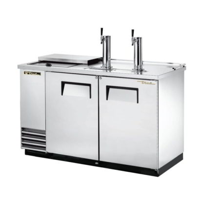 Fans blow air around the True TDD-2CT-S-HC draft beer system’s interior for even cooling, and their motors are electronically commutated. These motors, unlike traditional motors, work while producing little heat and using little energy. To retain cold air, walls and doors contain dense polyurethane insulation. Since magnetic door gaskets create an airtight seal, heat will not enter the cabinet. For servicing and cleaning, the refrigeration unit is self-contained and accessible from behind the front grill.