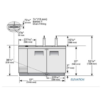 Club Top Draft Beer Cooler, (2) 1/2 keg capacity, stainless steel counter top & lid, (2) solid hinged doors with locks, (1) PVC coated adjustable wire shelf, LED interior light, (2) 3″ dia. insulated beer columns with single faucet draft arm, stainless steel exterior, galvanized interior with stainless steel floor, R290 Hydrocarbon refrigerant, 1/4 HP, 115v/60/1-ph, 2.8 amps, NEMA 5-15P, cULus, UL EPH Classified, Made in USA, ENERGY STAR
