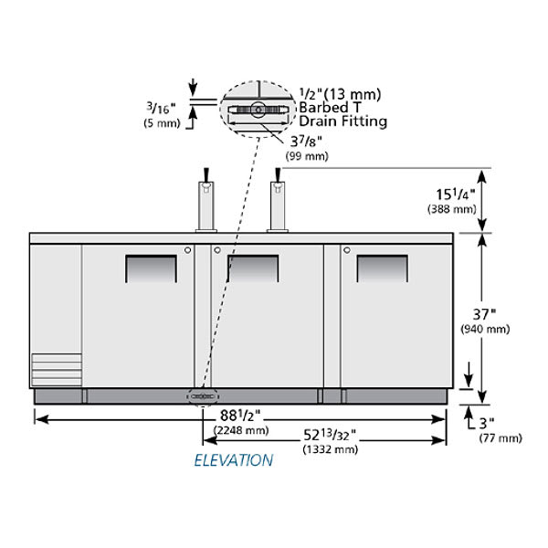 Draft Beer Cooler, (4) 1/2 keg capacity, stainless steel counter top, (3) solid hinged doors with locks, (2) 3″ dia. insulated beer columns with single faucet draft arm, stainless steel front & sides exterior, aluminum back, galvanized interior with stainless steel floor, R290 Hydrocarbon refrigerant, 1/4 HP, 115v/60/1-ph, 2.8 amps, NEMA 5-15P, cULus, UL EPH Classified, Made in USA, ENERGY STAR
