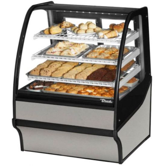 The exterior of the True TDM-R-36-GE/GE-S-W full-service bakery case is made of stainless steel that resists rusting, denting, and scratching, and its white powder-coated, cold-rolled steel interior is insulated with foamed-in-place polyurethane to retain cool air. Adjustable, PVC-coated shelves can support 150 pounds each, and the case can hold two 18-inch by 26-inch pans, two 9-inch by 26-inch pans, and four 12-inch by 18-inch pans. The single-pane, curved front glass opens for access to product, while the two rear glass doors slide open and close.