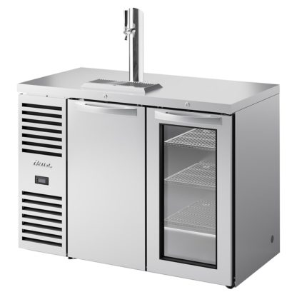 Refrigerated Draft Bar Cooler, two-section, 48″W, side mounted self-contained refrigeration, stainless steel countertop, (1) solid & (1) glass hinged door (locking), (3) PVC coated adjustable wire shelves, (1) 3″ dia. insulated beer column with single faucet draft arm and 2-way manifold, (1) slim quarter keg capacity, (1) 15″ surface mounted drip tray (centered over left door), LED interior lighting, stainless steel exterior, stainless steel interior sides & floor, R290 Hydrocarbon refrigerant, 1/5 HP, 115v/60/1-ph, 1.8 amps, NEMA 5-15P, cULus, UL EPH Classified, Made in USA