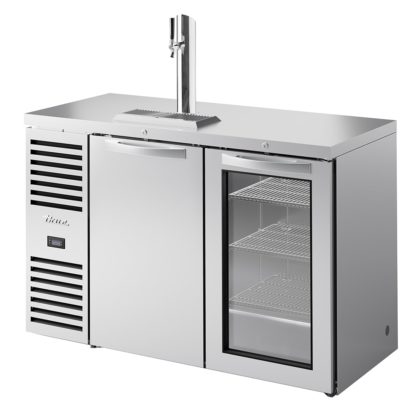 Refrigerated Draft Bar Cooler, two-section, 52″W, side mounted self-contained refrigeration, stainless steel countertop, (1) solid & (1) glass hinged door (locking), (3) PVC coated adjustable wire shelves, (1) 3″ dia. insulated beer column with single faucet draft arm and 2-way manifold, (1) 15″ surface mounted drip tray, LED interior lighting, stainless steel exterior, stainless steel interior sides & floor, R290 Hydrocarbon refrigerant, 1/5 HP, 115v/60/1-ph, 1.8 amps, NEMA 5-15P, cULus, UL EPH Classified, Made in USA