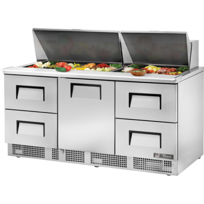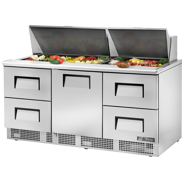 The True TFP-72-30M-D-4 prep table includes 30 sixth-size food pans to hold fresh ingredients in the refrigerated prep area that is covered by foam-insulated steel lids, protecting food freshness and maintaining the energy efficiency of the equipment. A factory-balanced, capillary tube refrigeration system equipped with a forced air system ensures products held in the pans are kept between 33 and 41 degrees Fahrenheit depending the temperature set by the operator. Flow of R134A refrigerant is regulated by a tube system.