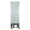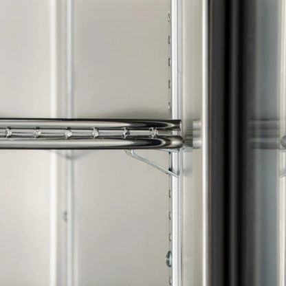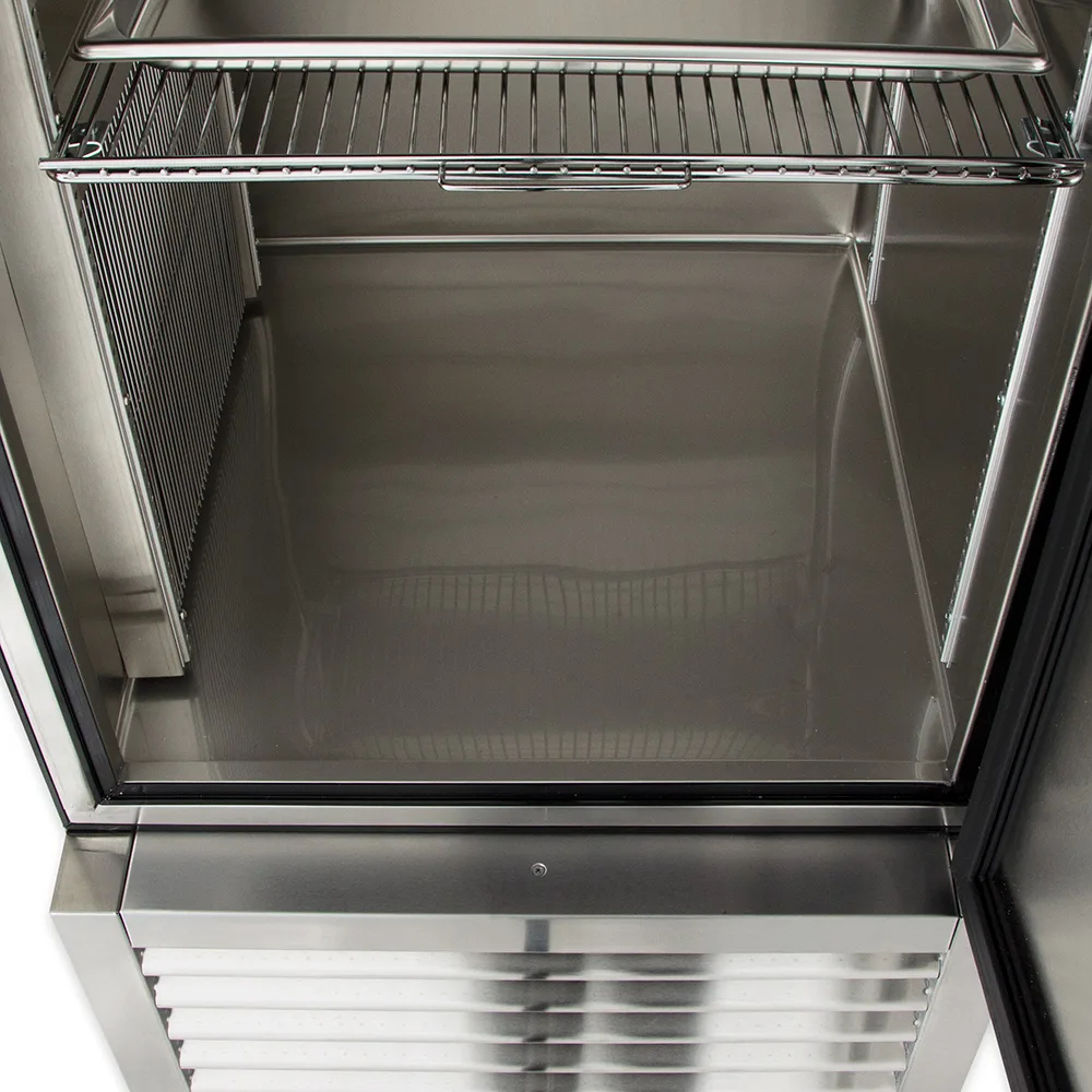 The interior is illuminated with lights so product is visible. Its door is made of stainless steel, and because it is recessed, the 12-inch-long handle does not take up aisle space. Preventing warm air from seeping out, the door closes on its own, while a magnetic gasket snaps into the door frame and can be removed without tools. To control humidity, a top vent can be adjusted, and a humidity pan is included for foods that need extra humidity.
