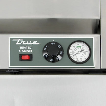The True TH-23 heated holding cabinet keeps cooked and baked food warm and should not be used to heat cold or ambient products. It has a stainless steel front with aluminum ends and a GalFan-coated steel back, while its interior is lined with stainless steel. All of these materials provide corrosion and dent resistance, and for structure, its walls are foamed with polyurethane insulation. Enabling movement, 4-inch-diameter castors are included. This unit maintains set temperatures between 80 and 180 degrees Fahrenheit. A stainless steel heating element efficiently generates heat, and low-velocity fans evenly disperse warm air throughout the cabinet. An external digital thermometer accurately displays the temperature.