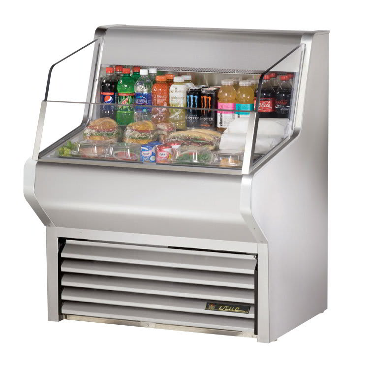 The True THAC-36-LD horizontal open air refrigerated merchandiser has an open-air design to expedite grabbing drinks and snacks. The cold-air curtain is used to keep products between 35 and 40 degrees Fahrenheit. When customers grab something out of the merchandiser, the evaporator fan motor and fan blades work quickly, using high volume airflow to recover temperatures and keep products safe. Because the entire unit is insulated with foamed-in-place polyurethane, cold air stays in the cabinet. The three-level tiered, stainless steel floor displays products in an efficient way while being durable and simple to clean. While this unit is convenient to use in many grab-and-go applications, there are a few recommended operating conditions that should be followed. The True THAC-36-LD horizontal open air refrigerated merchandiser should not be in an environment that will exceed ambient temperatures of 75 degrees Fahrenheit or a relative humidity of 55 percent. It should not be installed in direct sunlight, near HVAC vents, doorways, or fans that could compromise the functionality of the unit. The merchandiser works most efficiently when filled with product.
