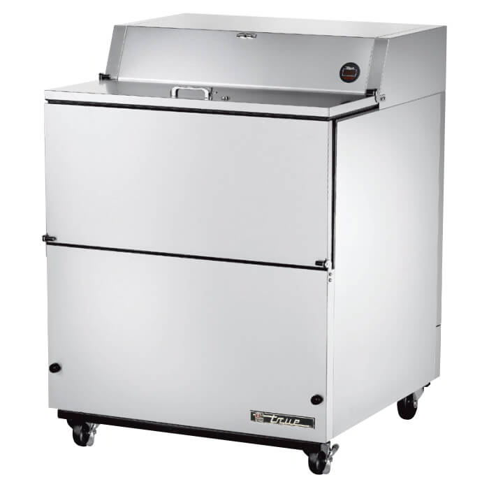 The True TMC-34-S-HC milk cooler can hold eight standard milk crates, supported by two floor racks and a stainless steel floor. Milk can be restocked and retrieved through two doors, a drop door on the front and a flip-up door on the top, and the exterior is constructed of durable stainless steel that can stand up to the heavy traffic of a school lunchroom. Its interior has a clear-coat over aluminum to resist corrosion. Along with a powder-coated steel frame rail, foamed-in-place polyurethane insulation provides structure inside the cabinet.