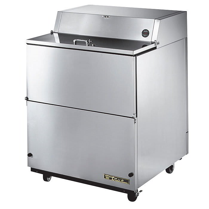 The True TMC-34-S-SS-HC milk cooler can accommodate eight 13-inch by 13-inch by 111/8-inch crates, and its heavy-duty stainless steel construction simplifies cleaning the interior, exterior, and door. Its floor is reinforced with racks that support heavy loads. Four castors make it simple to move the unit, place it in cafeteria lines, and be cleaned underneath, while the door can be locked to prevent theft and tampering. To retain cool air, the unit is insulated with polyurethane insulation that has been foamed in place.