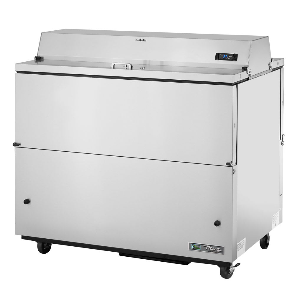 The forced-air refrigeration system in this unit uses a capillary tube and R290 hydrocarbon refrigerant to consistently hold the selected temperature for contents, with a total temperature range of 33 to 38 degrees Fahrenheit. Cold air is kept inside by polyurethane insulation in the walls and magnetic gaskets that line the door frames. The temperature can be monitored by an external display and the condenser can be reached by sliding it out the back of this True TMC-49-S-DS-HC milk cooler.