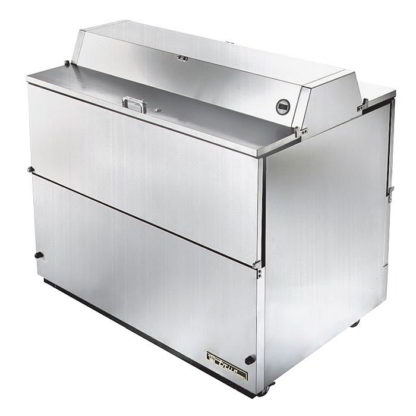 Mobile Milk Cooler, forced-air, (12) 13″ x 13″ x 11-1/8″ crate capacity, dual sided stainless steel drop front/hold-open flip-up lids with locks, 33 – 38°F temperature range, (3) heavy-duty floor racks, digital thermometer, white vinyl exterior, stainless steel interior & floor, 4″ castors, R290 Hydrocarbon refrigerant, 1/5 HP, 115v/60/1-ph, 2.7 amps, NEMA 5-15P, cULus, UL EPH Classified, Made in USA