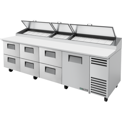 The True TPP-AT-119D-6-HC prep table includes 15 third-size pans for its top compartment, so ingredients for pizzas can be placed in the pans and accessed conveniently when users are topping dough before it is baked. Insulated lids cover the pans to keep contaminants out while retaining cold air and maintaining freshness. A full-length cutting board on the front of the table provides a prep space for pizzas and other large products, while additional items can be stored in the cabinet base, which is made up of six drawer sections. Each section can hold two full-size, 8-inch-deep hotel pans, though these are not included.