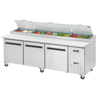 Pizza Prep, 33 – 41°F pan rail, stainless steel cover, 19-1/2″D cutting board, (2) drawers, accommodates (2) 12″ x 20″ x 8″D pans (NOT included), includes: (6) 1/3 size clear polycarbonate insert pans (top), stainless steel front, top & sides, aluminum interior with stainless steel floor, 5″ castors, front breathing, R290 Hydrocarbon refrigerant, 1/4 HP, 115v/60/1-ph, 3.9 amps, NEMA 5-15P, UL EPH Classified, cULus, CE, Made in USA