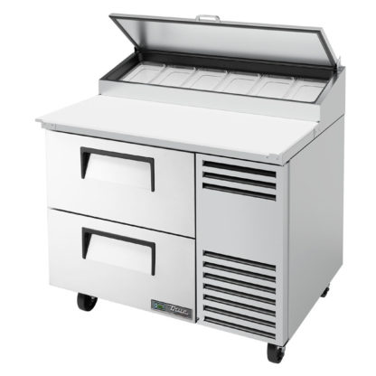 For pizzerias and Italian restaurants, the True TPP-AT-44D-2-HC prep table is designed for pizza making, accommodating ingredients to top pizzas in the pan rail section with six third-size pans. Product from these pans can be added to pizzas sitting on the full-length cutting board, and storage space for more product is available in the base, which is made up of two drawers. Each drawer has a 12-inch-long handle and can accommodate two 12-inch by 20-inch by 8-inch-deep pans.