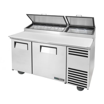 The full-length, extra-deep removable cutting board in the True TPP-AT-60-HC prep table measures 191/2 inches deep for pizza preparation and provides more work room for smaller product. It comes with eight third-size insert pans in the top of the unit. The forced-air cooling system keeps light products, such as vegetables, at safe serving temperatures.