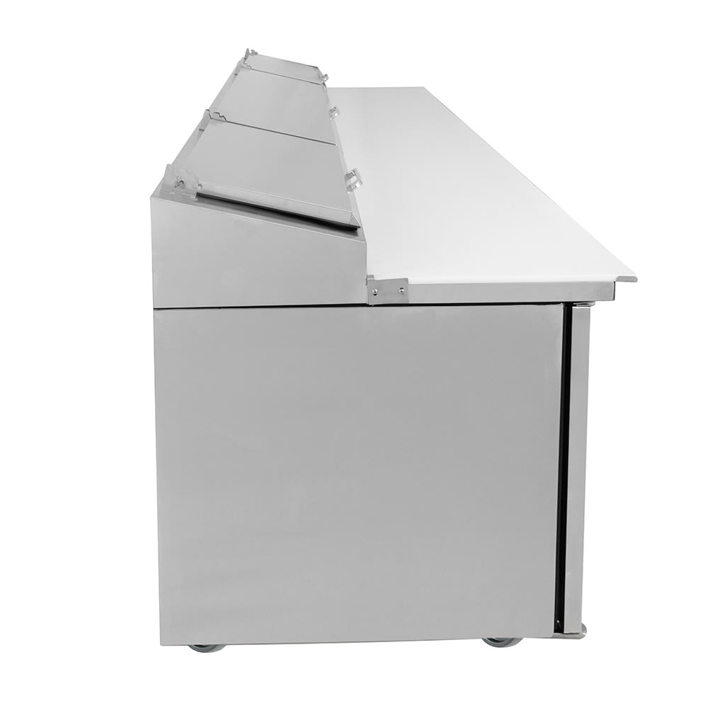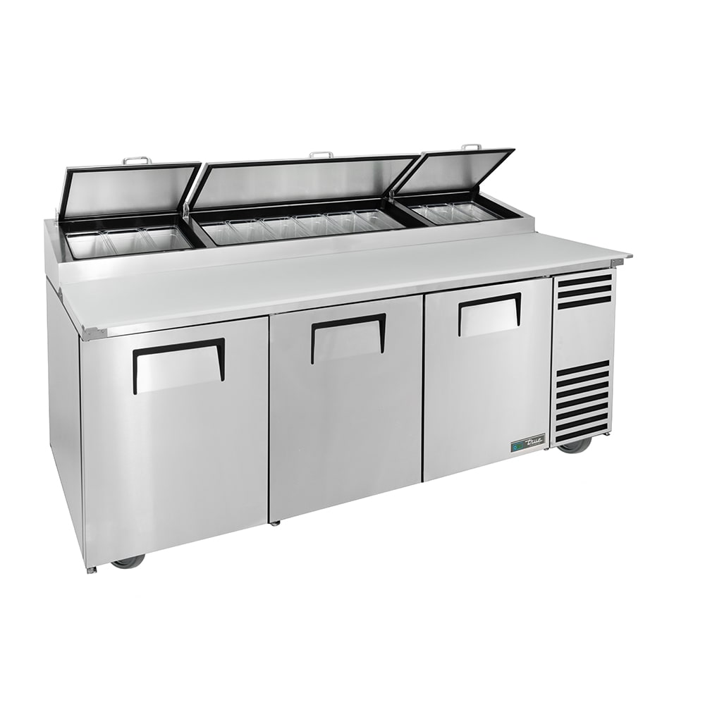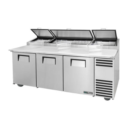 The True TPP-AT-93-HC pizza prep table has a 19-inch-wide cutting board that can hold small, medium, and large pizzas. Pizzas slide over the top, and operators can grab ingredients from 12 third-size pans. Because these pans are held in a refrigerated pan rail at a 13-degree angle, operators do not need to strain as much to grab ingredients. Each covered by insulated lids, the pan rail is divided into sections, and when a section is not needed, the lid can cover the food, locking in freshness.