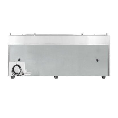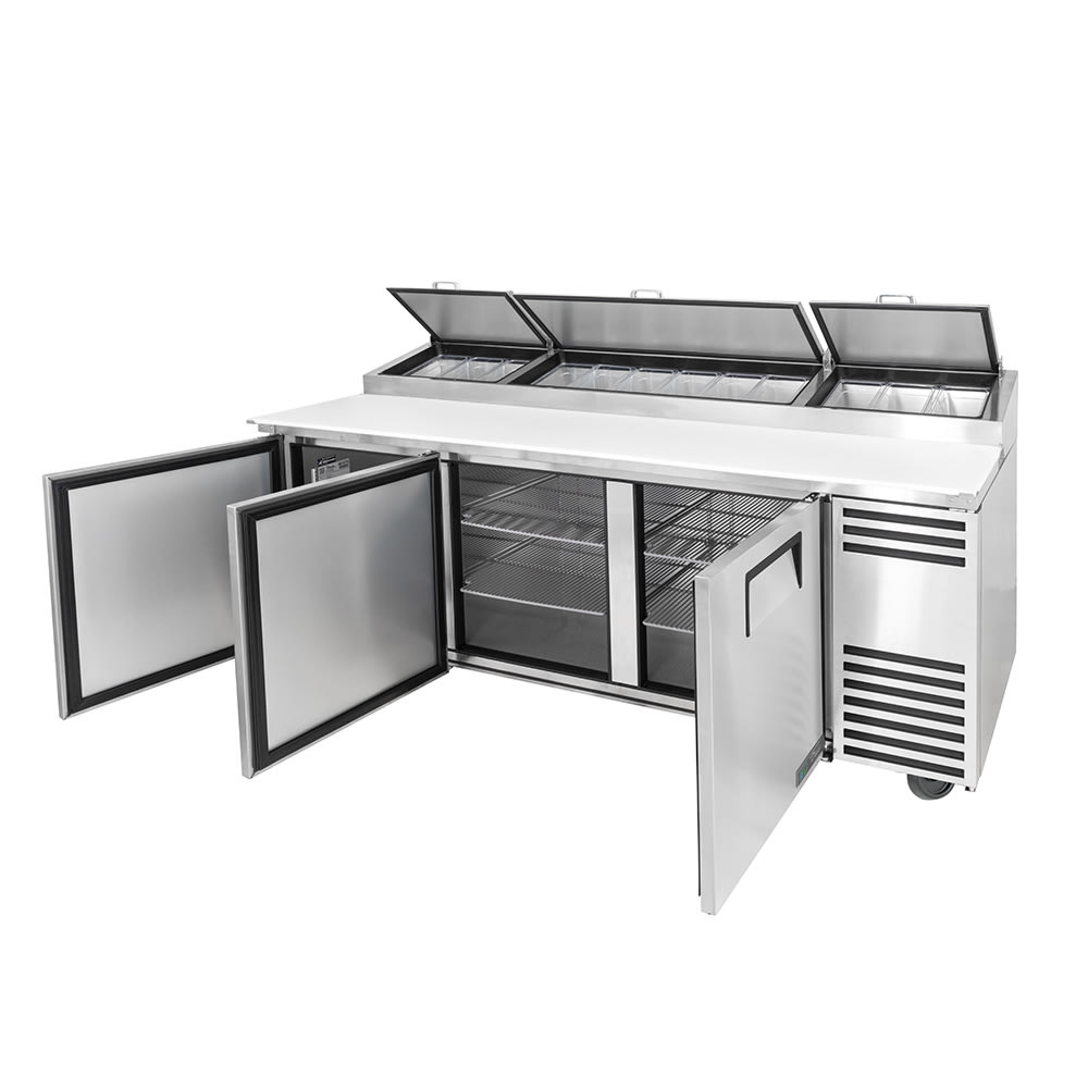 Pizza Prep, 33 – 41°F pan rail, stainless steel cover, 19-1/2″D cutting board, (3) full doors, (6) PVC coated adjustable wire shelves, includes: (12) 1/3 size clear polycarbonate insert pans (top), stainless steel front, top & sides, aluminum interior with stainless steel floor, 5″ castors, front breathing, R290 Hydrocarbon refrigerant, 3/4 HP, 115v/60/1-ph, 7.1 amps, NEMA 5-15P, UL EPH Classified, cULus, CE, Made in USA