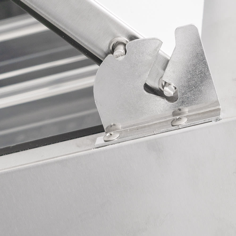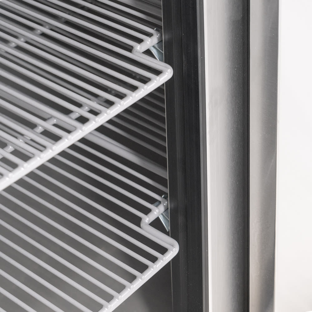 For convenience, additional ingredients can be stocked in the refrigerated base, and the six wire shelves are adjustable and removable to accommodate a variety of products. For corrosion resistance, the walls, ceiling, and shelves are all coated, while the floor is made of rust-resistant stainless steel. Corners in the floor are coved to prevent debris buildup.