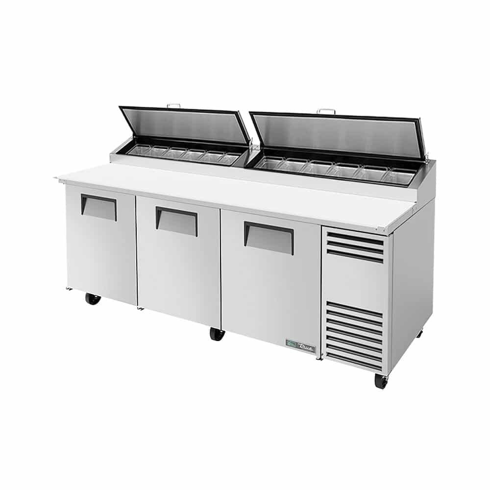 Utilizing R290 hydrocarbon refrigerant, the True TPP-AT2-93-HC pizza prep station maintains an ideal temperature range between 33 and 41 degrees Fahrenheit with its powerful condenser that circulates cold temperatures using its capillary tube system. This method is further supported by its dense layer of insulation as well as its evaporator coil, which is wrapped in epoxy for corrosion resistance. For maintenance purposes, its condenser is easy to access, and its fans can be reversed to expel dust and debris with less effort on the part of the operator.