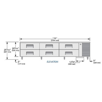 Refrigerated Chef Base, 110″W base, one-piece 300 series 18 gauge stainless steel top with V edge, (6) drawers (accommodates (2) 12″ x 20″ x 4″ pans, NOT included), stainless steel front/sides, aluminum back, aluminum interior with stainless steel floor, 4″ castors, 1/3 HP, 115v/60/1-ph, 9.5 amps, NEMA 5-15P, cULus, UL EPH Classified, CE, Made in USA