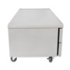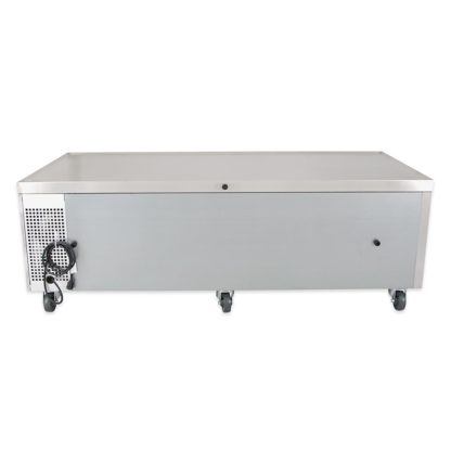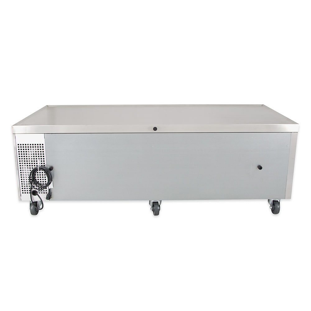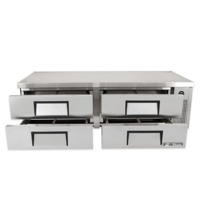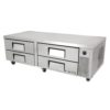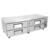 Refrigerated Chef Base, 72-3/8″L base, one-piece 300 series 18 gauge stainless steel top with V edge, stainless steel front/sides, aluminum back, aluminum interior with stainless steel floor, (4) drawers [accommodates (2) 12″x20″x4″ pans, NOT included], 4″ castors, 1/3 HP, 115v/60/1, 9.9 amps, 7′ cord, NEMA 5-15P, cULus, UL EPH Classified, CE, MADE IN USA