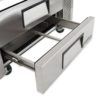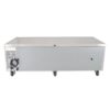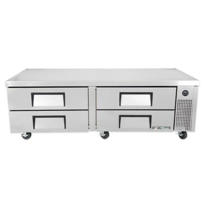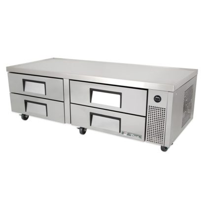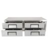 For cold storage, this True TRCB-72 chef base has four drawers that each hold two full-size food pans, which must be purchased separately. The interior is fitted with a clear-coated aluminum liner for corrosion resistance, while its stainless steel floor has rounded corners to facilitate cleaning. Food stored in the base is kept at a set temperature between 33 and 38 degrees Fahrenheit, which are maintained by R134A refrigerant flowing through capillary tubes and can be monitored on an external display. To ensure consistent cooling, fans with large blades blow air around the drawers, and because the refrigeration system’s condenser is located behind the side grill, it conveniently slides out for maintenance.