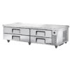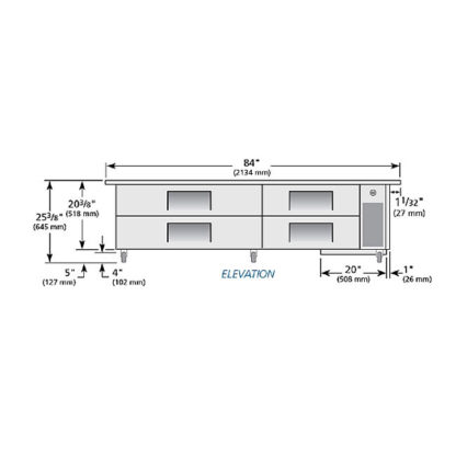 Refrigerated Chef Base, 82-3/8″W base, 84″W one-piece 300 series 18 gauge stainless steel top with V edge, (4) drawers (left drawer accommodates (3) and right drawer accommodates (2) 12″ x 20″ x 4″ pans, NOT included), stainless steel front/sides, aluminum back, aluminum interior with stainless steel floor, 4″ castors, 1/3 HP, 115v/60/1-ph, 10.3 amps, NEMA 5-15P, cULus, UL EPH Classified, CE, Made in USA