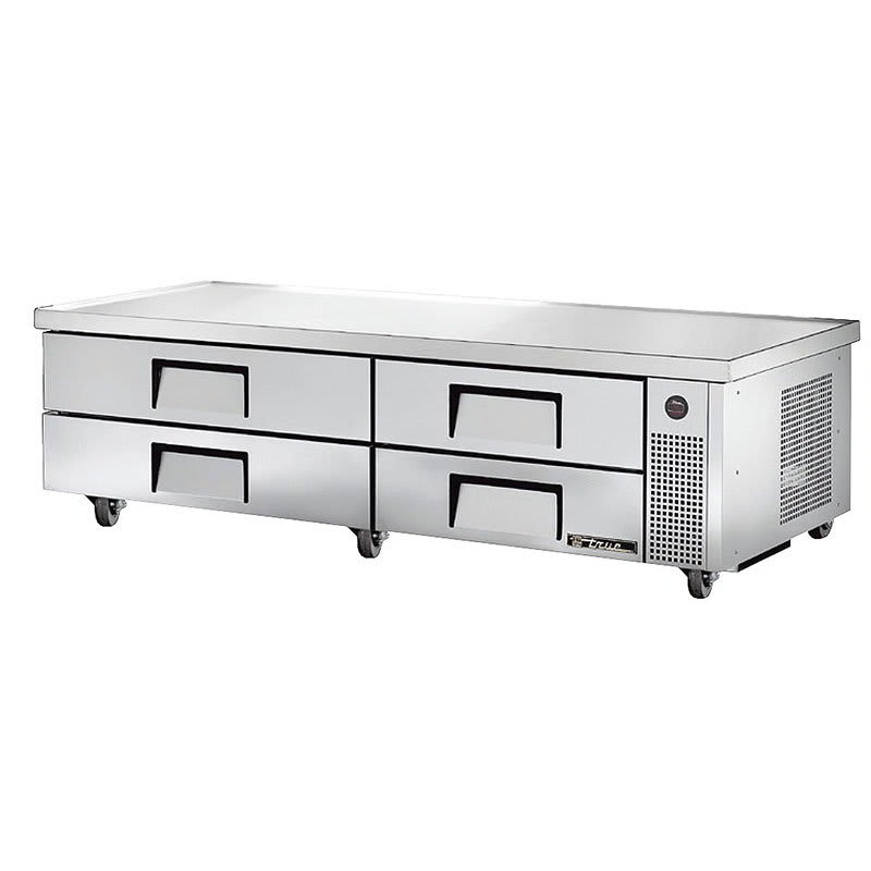 Each sturdy drawer retains cold air with dense polyurethane foam and gaskets around the frame. Inside the True TRCB-82-84 chef base, operators can set the temperature between 33 and 38 degrees Fahrenheit, and these cold temperatures are produced as R134A refrigerant moves through the capillary tubes. A large, self-lubricating evaporator fan blows cold air around the cabinet, while the internal temperature can be checked on the digital display, which is mounted on the exterior. For convenient service access, cooling components are self-contained and slide out from the side.