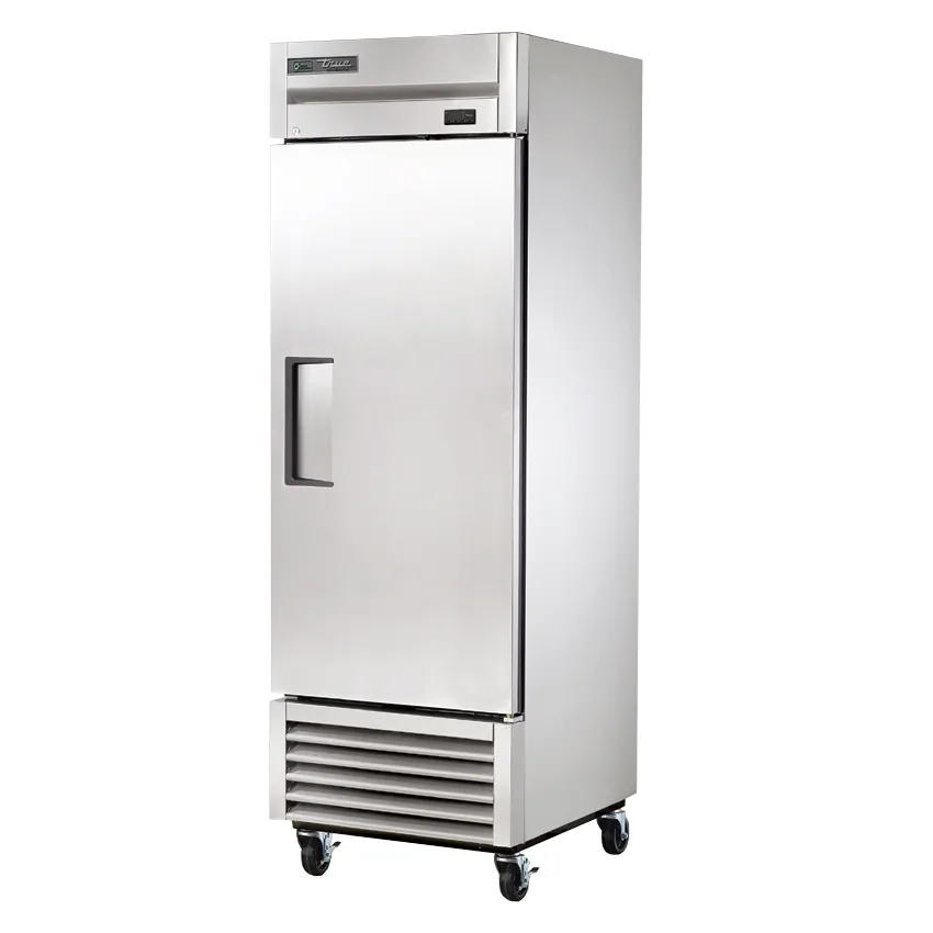 The True TS-23-HC single-section refrigerator has a stainless steel exterior and interior that resists rust, scratches, and dents. Its steel frame rail adds structure and strength, and the polyurethane insulation retains cold air. With a positive seal, the door closes by itself to prevent warm air from being taken in, while gaskets around the door prevent cold air leaks and remove for cleaning and replacing. Mobility is provided by the 4-inch-diameter castors.