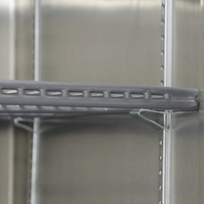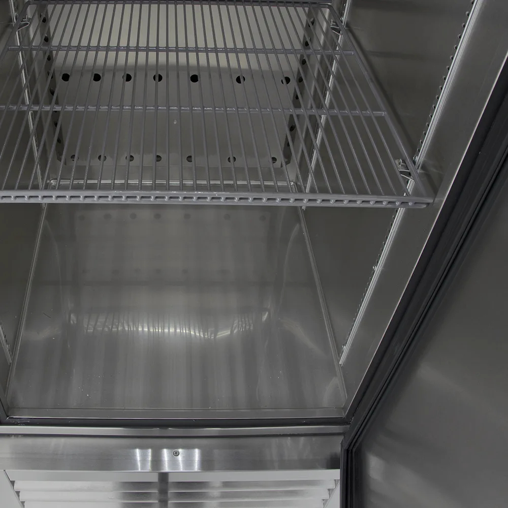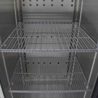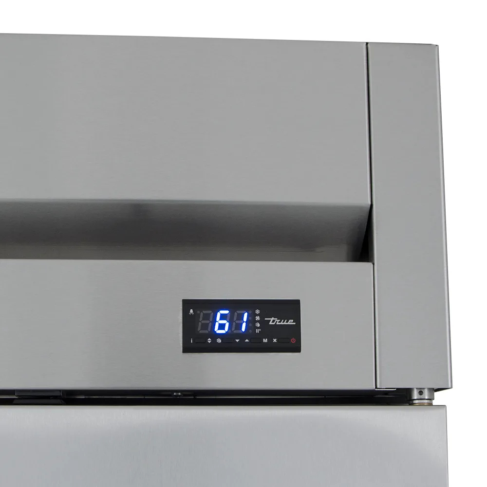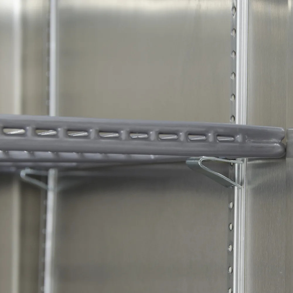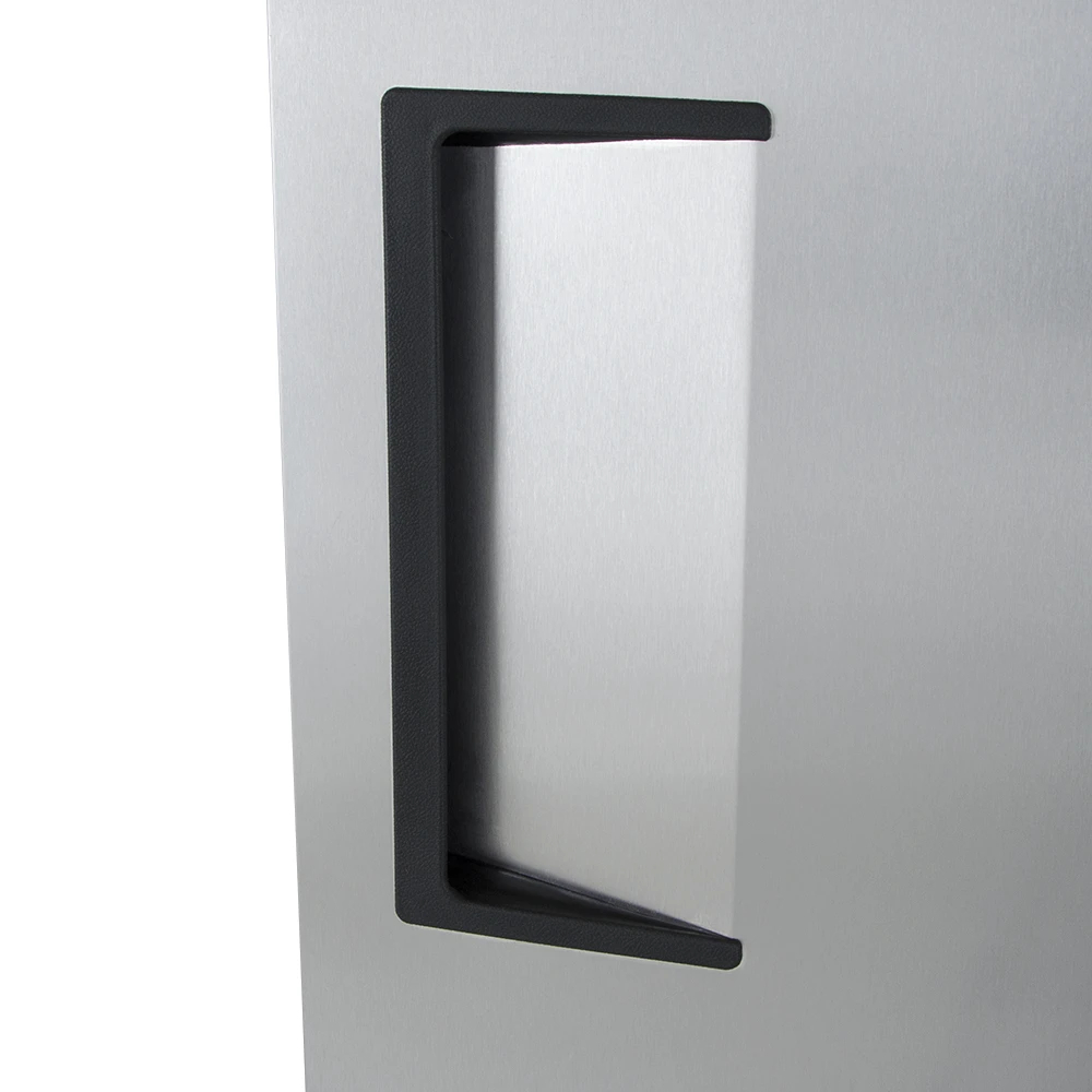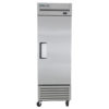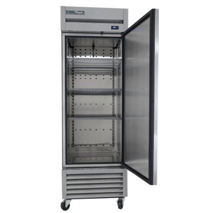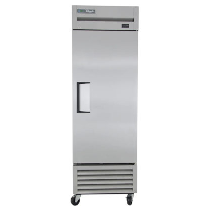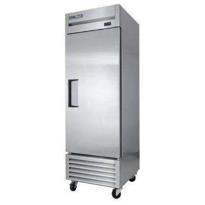 This True TS-23F-HC reach-in freezer is ideal for small venues or businesses with limited available space, and its solid stainless steel door has a durable door hinge with a permanently attached handle. Because the handle is recessed, it lowers the risk of denting nearby equipment. To resist corrosion, the exterior is constructed of stainless steel with a GalFan-coated steel back, while the interior is made of stainless steel, which is scratch and rust resistant. Stability is provided by the steel frame rail, and structure is created by the foamed-in-place polyurethane insulation. Three PVC-coated shelves can be adjusted in 1⁄2-inch increments to accommodate different sizes of products.