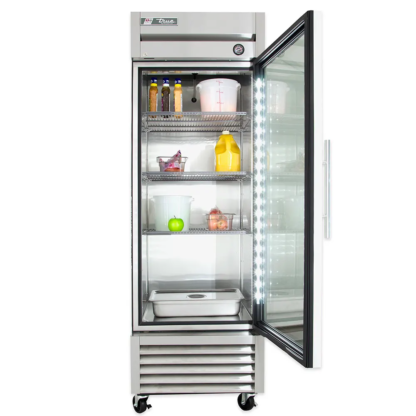 Refrigerator, reach-in, one-section, framed glass door version 01, (1) glass door, (3) gray PVC coated adjustable wire shelves, LED interior lighting, stainless steel front/sides, stainless steel interior, 4″ castors, R290 Hydrocarbon refrigerant, 1/4 HP, 115v/60/1-ph, 2.2 amps, NEMA 5-15P, cULus, UL EPH Classified, Made in USA