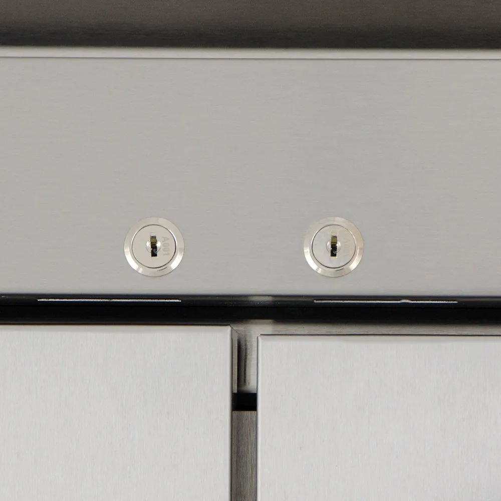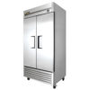 Two solid doors have a self-closing feature to prevent cold air escape while magnetic gaskets line the door frames, creating an airtight seal. The 12-inch recessed handles have a sheet metal interlock so they are permanently attached to the doors, and the cabinet exterior is made of stainless steel, resisting bends, dents, and rust. Its interior floor is also made of stainless steel and has coved corners to simplify cleanup. PVC-coated shelves can be removed for cleaning, and they can be adjusted in 1⁄2-inch increments for product organization. LED lights illuminate the interior, so the product is visible, and this True TS-35-HC two-section refrigerator is mounted on 4-inch castors, so it can be moved as needed.