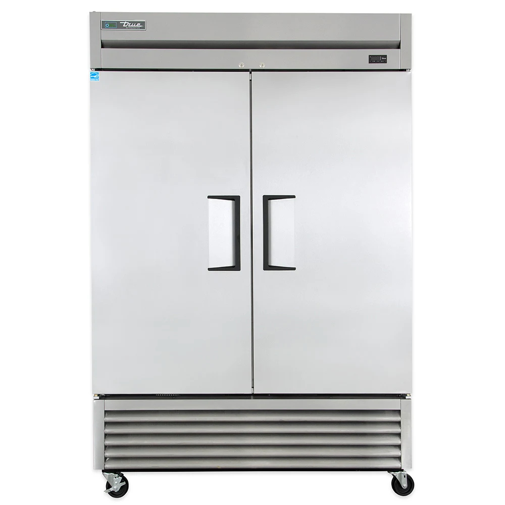 The True TS-49-HC reach-in refrigerator features solid stainless steel doors that self-close to keep cold air in the cabinet, while its interior is lined with stainless steel that is quick to wipe down. In the door frame, magnetic gaskets snap-in to create a strong seal and can be removed without tools for cleaning. Its floor and six shelves, which can be adjusted in 12-inch increments, support and organize food in the cabinet. The set internal temperature ranges from 33 to 38 degrees Fahrenheit and is shown on the external digital display.