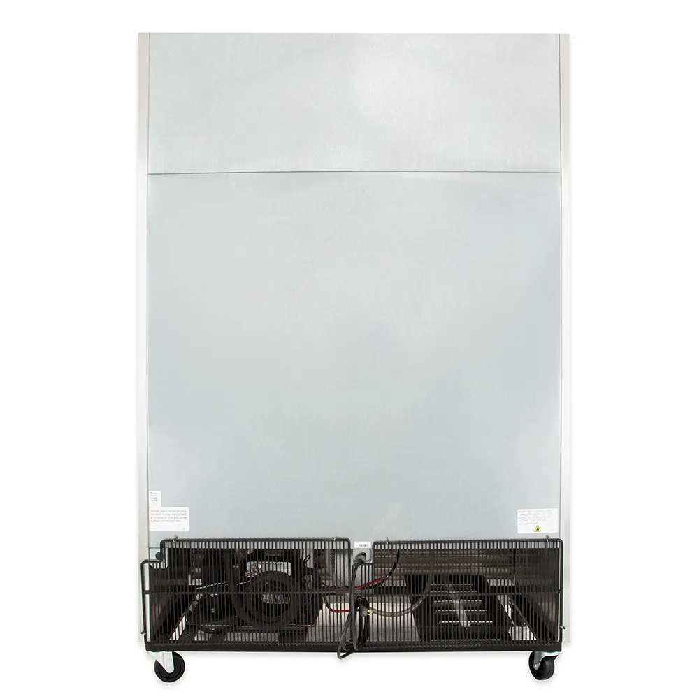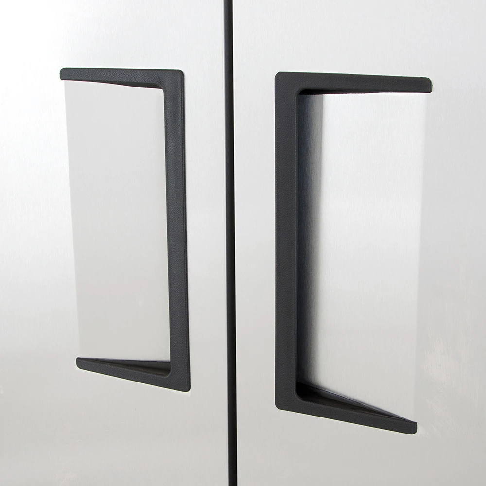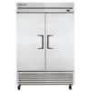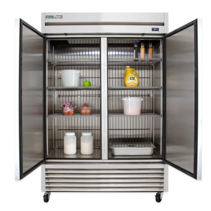 The True TS-49F-HC two-section freezer has six adjustable, PVC-coated shelves to organize products and LED lights to illuminate the interior. Its doors open comfortably with their 12-inch recessed handles, and gaskets around the doors prevent cold-air leaks. Polyurethane insulation in the walls retains cold air, while the structure is provided by the steel frame rail. To resist rust, scratches, and dents, this refrigerator’s exterior and interior are made of stainless steel.