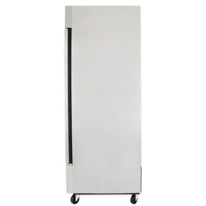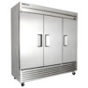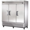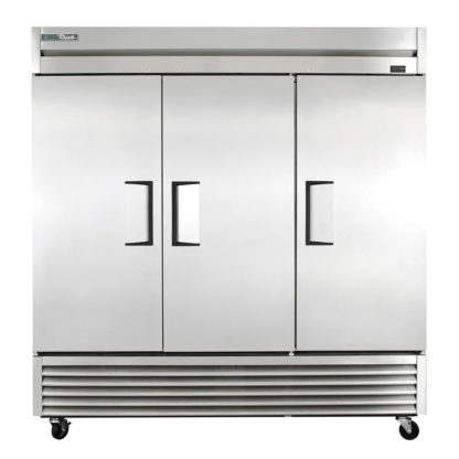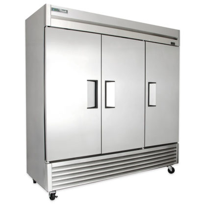 For durability and dent resistance, the True TS-72F-HC three-section reach-in freezer’s exterior front, sides, doors, and interior liner and floor are made of stainless steel, while the freezer’s back is made of GalFan-coated steel to resist corrosion. In the cabinet, nine PVC-coated wire shelves are adjustable in 1⁄2-inch increments. Its three doors are self-closing to trap cold air inside, and their 12-inch-long handles are recessed, so they do not take up aisle space.