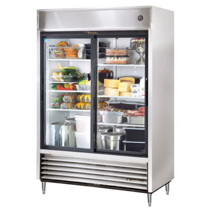 Because of its glass doors and LED lighting, the True TSD-47G-HC-LD reach-in refrigerator shows off product to customers. Its PVC-coated shelves and stainless steel floor resist corrosion in case of leaks, while the exterior surfaces are rust-resistant stainless steel, GalFan-coated steel, and anodized aluminum. Doors slide open efficiently because they are counterbalanced, and close by themselves to prevent cold air from escaping. Keeping cold temperatures inside, polyurethane insulation is foamed in the walls, and along with a heavy-duty frame rail, the insulation reinforces the cabinet structure.