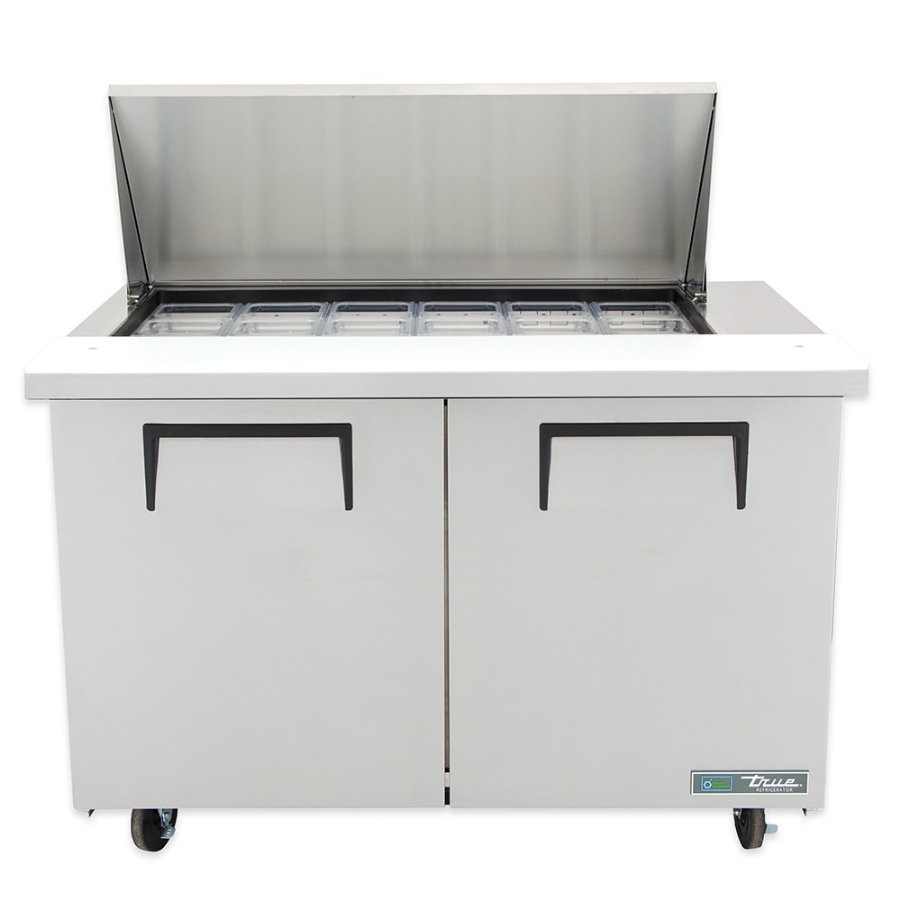 This True TSSU-48-18M-B-HC mega-top food prep table includes an 87⁄8-inch-wide polyethylene cutting board that runs the full length of the equipment’s countertop, giving staff a sanitary and convenient spot to prep ingredients and assemble dishes. To organize sandwich and salad toppings, 18 sixth-size pans are included in the top compartment, and although these pans are 4 inches deep, the prep table also accommodates 6-inch-deep pans. When not using ingredients, an insulated lid can be pulled over them to keep products cold and fresh.