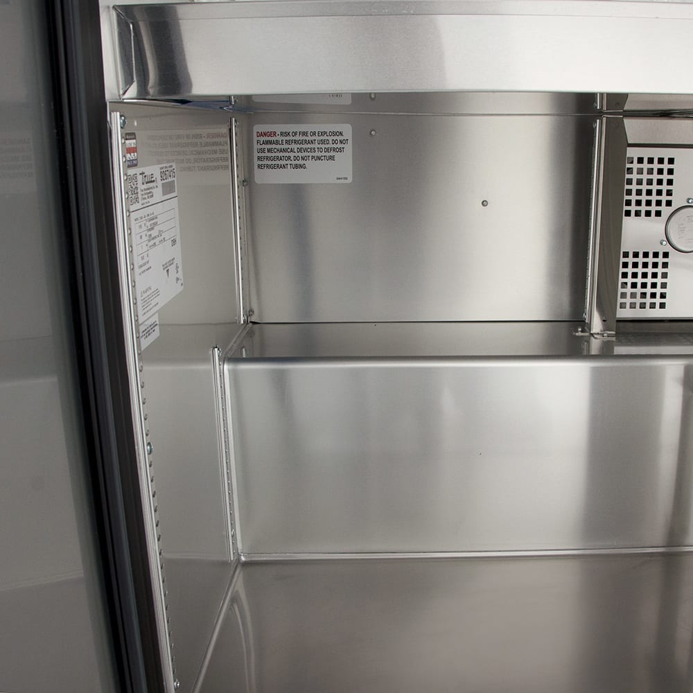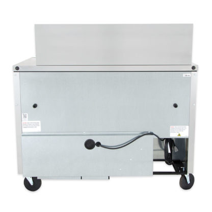 For rust resistance, this prep table’s exterior is constructed of stainless, coated steel. Both cabinet doors have 12-inch handles for comfortable opening and a self-closing mechanism that activates under 90 degrees. Inside the cabinet, plenty of chilled space accommodates supplies and ingredients, and four shelves are adjustable and removable to fit various objects. Aluminum lines the interior, while the floor is stainless steel for quick cleanup. This floor’s corners are not sharp, enabling a cloth to remove debris without difficulty.