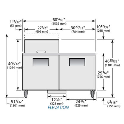 Mega Top Sandwich/Salad Unit, (12) 1/6 size (4″D) poly pans, stainless steel insulated cover, 8-7/8″D cutting board, (2) full doors, (4) PVC coated adjustable wire shelves, stainless steel top/front/sides, aluminum back, aluminum interior with stainless steel floor, 5″ castors, R290 Hydrocarbon refrigerant, 1/3 HP, 115v/60/1-ph, 6.5 amps, NEMA 5-15P, cULus, UL EPH Classified, Made in USA