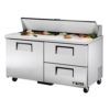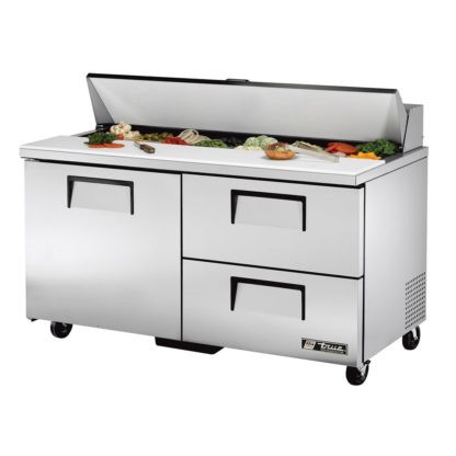 The True TSSU-60-16D-2-HC prep table comes equipped with 16 sixth-size, 4-inch-deep polycarbonate food pans in the countertop, but it can hold 6-inch-deep food pans that are sold separately. For energy efficiency, high-density polyurethane insulation fills the pan lid, cabinet structure, solid door, and drawer facings. The refrigeration system upholds a set temperature from 33 to 41 degrees Fahrenheit in the pans and cabinet, ensuring food is kept at safe temperatures. Large fans move the cold air over the pans and around the cabinet, so contents are cooled throughout.