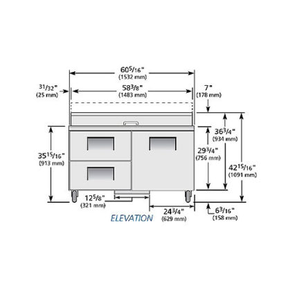 Sandwich/Salad Unit, (16) 1/6 size (4″D) poly pans, stainless steel insulated cover, 11-3/4″D cutting board, aluminum back, (1) door, (2) drawers (accommodates 6″D pan, NOT included), (2) PVC coated adjustable wire shelves, stainless steel top, front & sides, aluminum interior with stainless steel floor, 5″ castors, R290 Hydrocarbon refrigerant, 1/3 HP, 115v/60/1-ph, 6.5 amps, NEMA 5-15P, cULus, UL EPH Classified, Made in USA