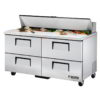 Spanning the length of the unit, the True TSSU-60-16D-4-HC food prep table has an 113/4-inch-deep cutting board that provides space for creating salads and sandwiches. Its top compartment comes with 16 sixth-size food pans, which are made of clear polycarbonate, and it can also accommodate varying size pan configurations with divider bars, although these must be purchased separately. Backup ingredients can be stored in drawers in the refrigerated base.