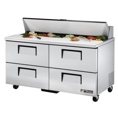Set by the operator, the temperature in the base and around the ingredient pans is held between 33 and 41 degrees Fahrenheit. Cold air is guided around the pans and drawers, so temperatures are consistent throughout. Mounted on castors, this True TSSU-60-16D-4-HC prep table is mobile, and locks are provided on the front set for stability. The unit has a sturdy stainless steel front, top, and ends, while the steel back is coated in corrosion-resistant GalFan.