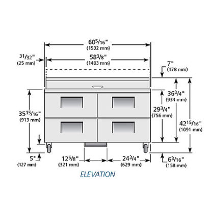 Sandwich/Salad Unit, (16) 1/6 size (4″D) poly pans, stainless steel insulated cover, 11-3/4″D cutting board, (4) drawers (accommodates (1) 6″D pan, NOT included), stainless steel top, front & sides, aluminum back, aluminum interior with stainless steel floor, 5″ castors, R290 Hydrocarbon refrigerant, 1/3 HP, 115v/60/1-ph, 6.5 amps, NEMA 5-15P, cULus, UL EPH Classified, Made in USA