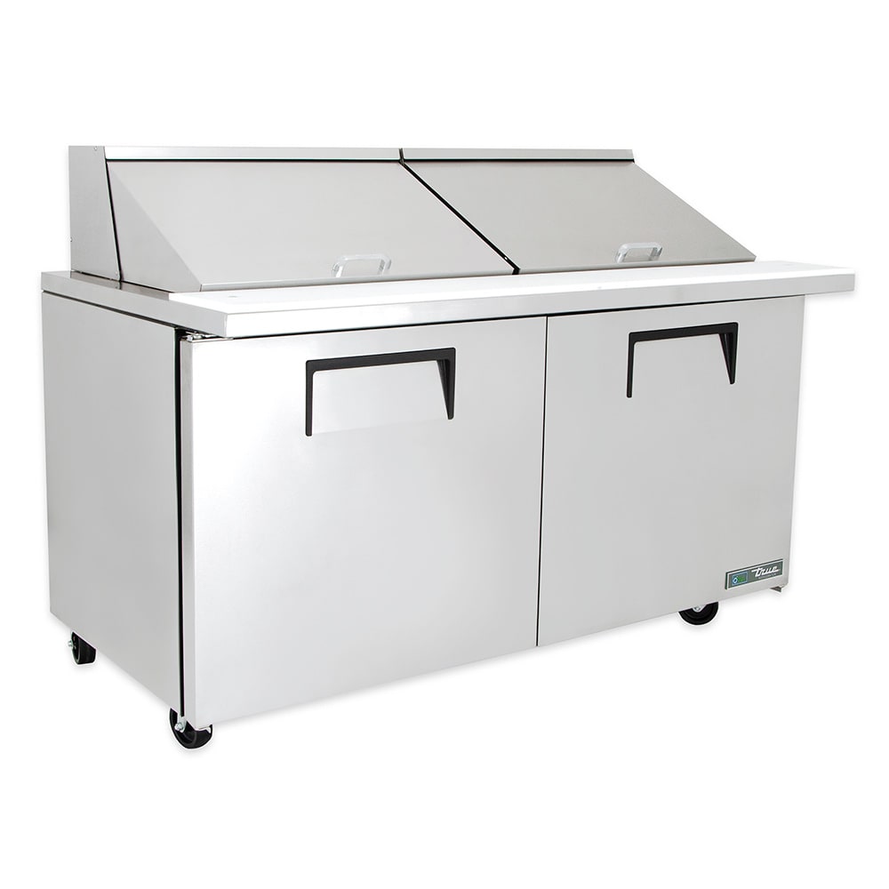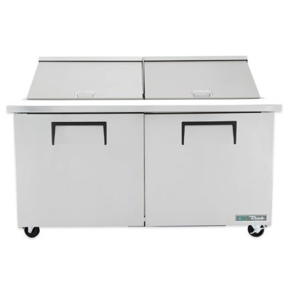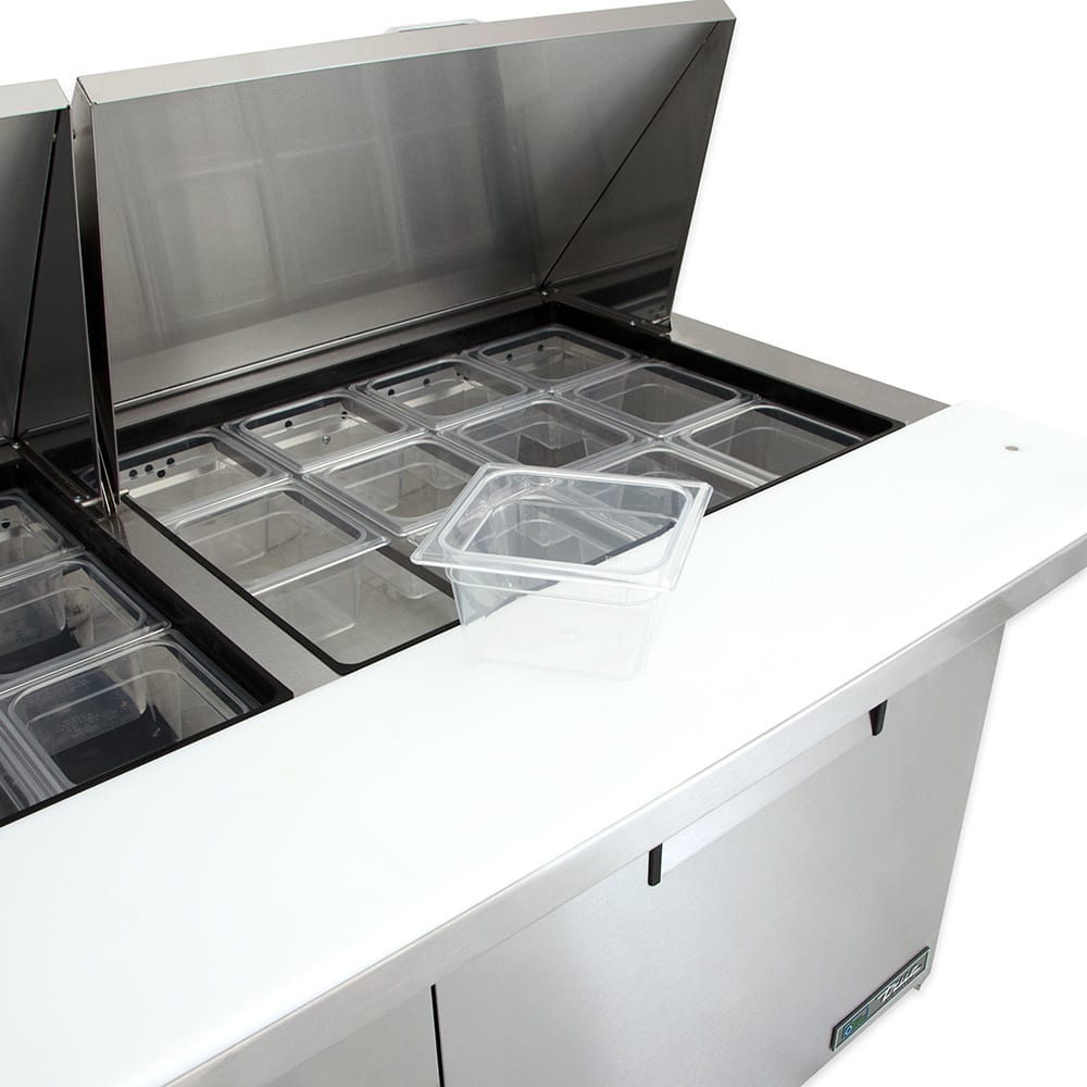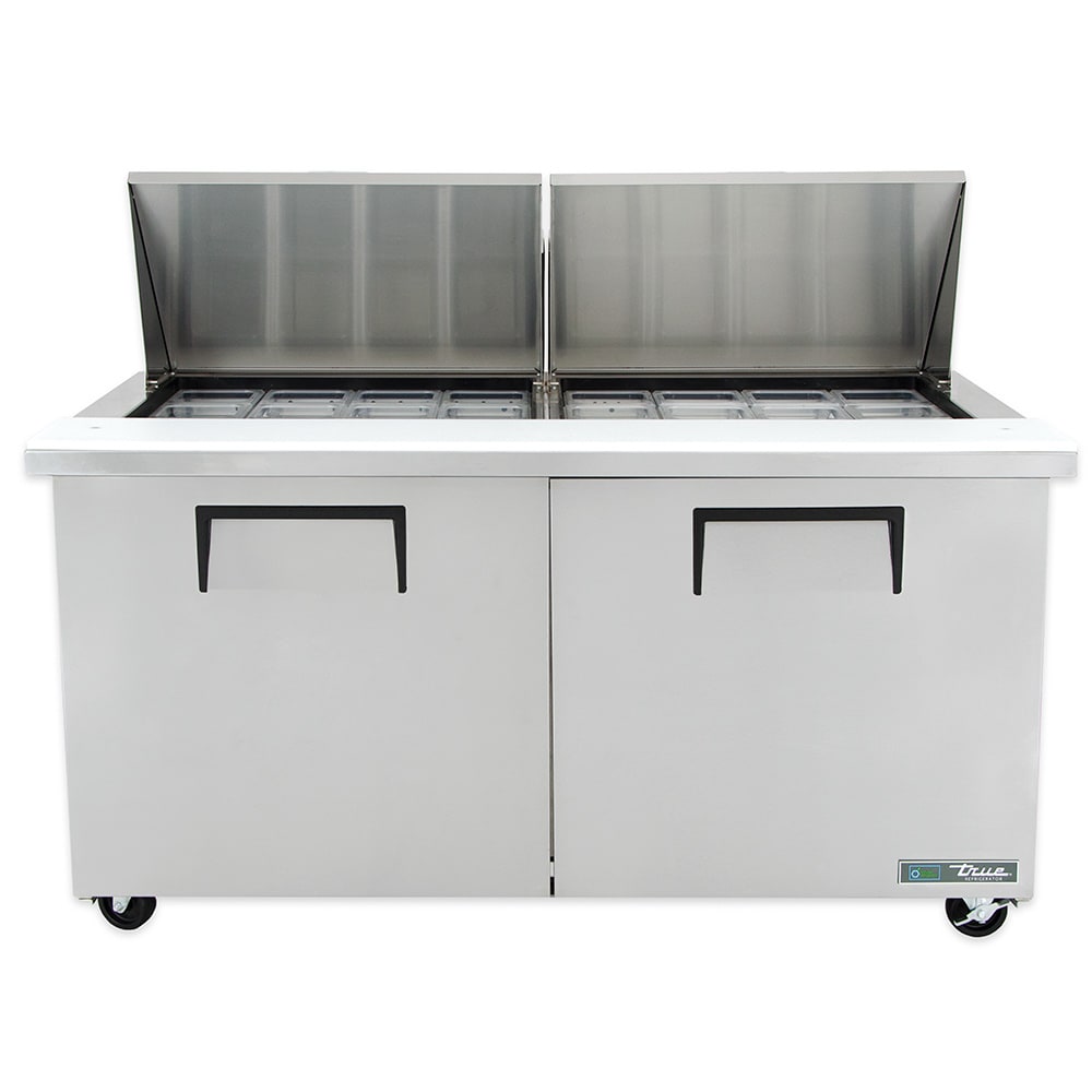 Part of the mega-top line, the True TSSU-60-24M-B-ST-HC prep table has an additional row in the top compartment, providing space for 24 sixth-size pans. These pans are included, and they are made of polycarbonate and have a 4-inch depth. A hood and lid assembly covers the top food pan area to keep cold air around the ingredients, maintain product freshness, and prevent condensation buildup. Spanning the width of the table, a cutting board enables users to assemble salads and sandwiches close to the ingredients.