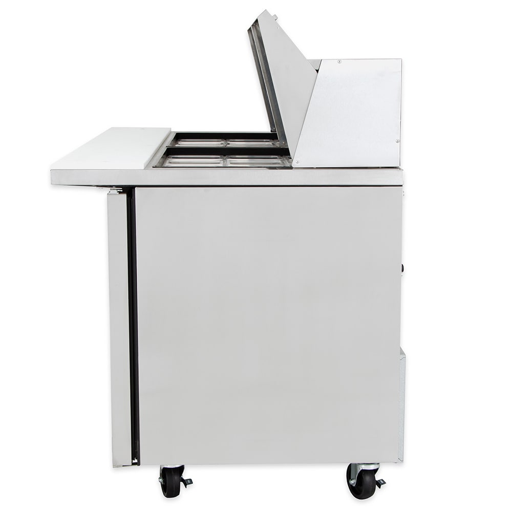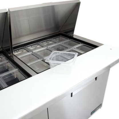 Mega Top Sandwich/Salad Unit, 34″ work surface height, (24) 1/6 (4″D) poly pans, (2) stainless steel insulated covers, 8-7/8″D cutting board, (2) full doors, (4) PVC coated adjustable wire shelves, stainless steel top/front/sides, aluminum back, aluminum interior with stainless steel floor, 3″ castors, R290 Hydrocarbon refrigerant, 1/3 HP, 115v/60/1-ph, 6.5 amps, NEMA 5-15P, cULus, UL EPH Classified, ADA Compliant, Made in USA