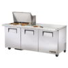 The True TSSU-12M-B food prep table uses R290 hydrocarbon refrigerant, which runs through the self-contained capillary tube system. Its patented forced-air design complies with and is listed under ANSI/NSF-7, holding product at a consistent temperature between 33 and 41 degrees Fahrenheit. The exterior of the unit is constructed of stainless steel with a GalFan-coated steel back for structural reinforcement. The interior is insulated with foamed-in-place polyurethane and has a clear-coated aluminum liner for corrosion resistance. Coved corners on the interior’s stainless steel floor aid in cleaning.