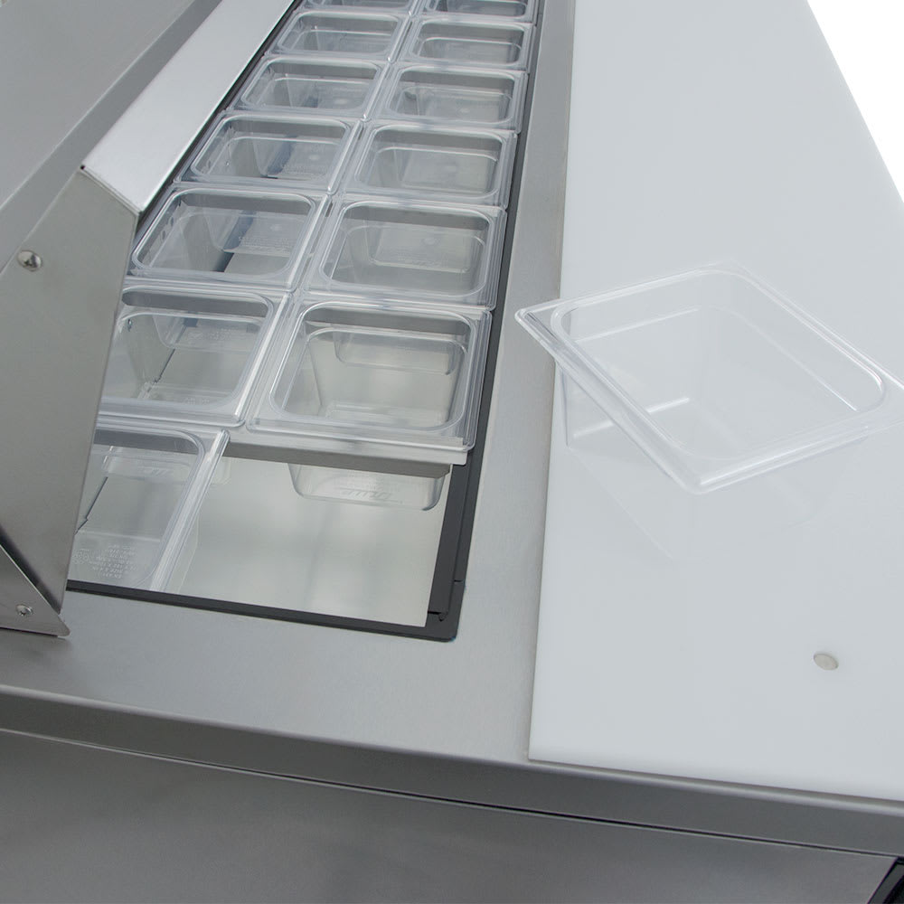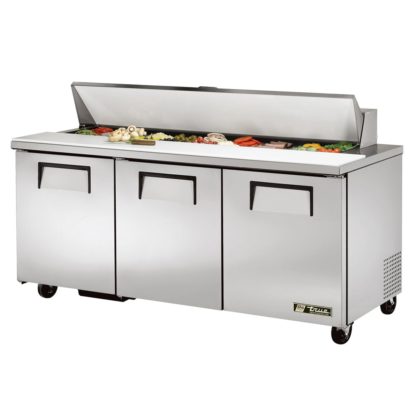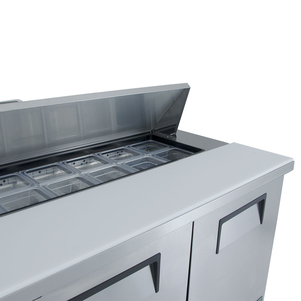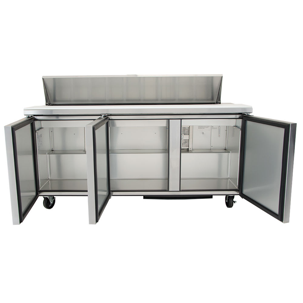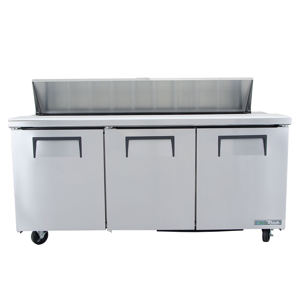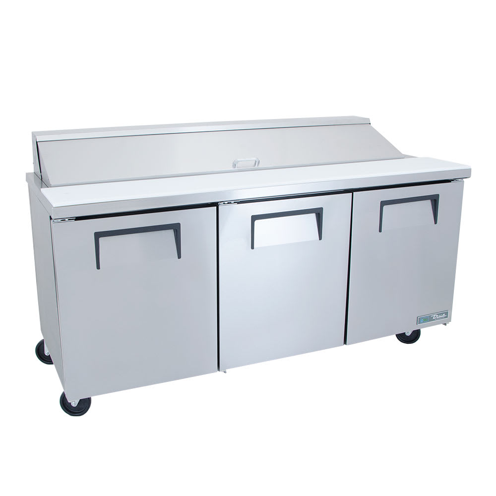 In the pan rail, this True TSSU-72-18-HC prep table has 18 sixth-size, 4-inch-deep pans that can hold ingredients for salads and sandwiches, and users can prepare meals on the full-length cutting board. Additional products can be stored in the cabinet base on six adjustable, corrosion-resistant shelves. Through its three doors, operators can access the aluminum-lined interior, which has a stainless steel floor that is quick to wipe down. These doors stay open past 90 degrees to ensure loading and unloading product is convenient.